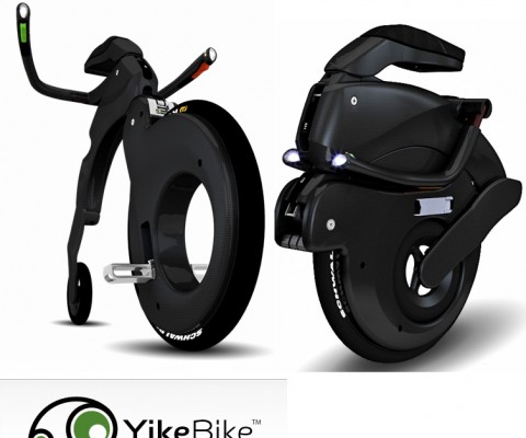 YikeBike - elektryczny rower miejski, z kierownicą z tyłu. Waga 10kg, maksymalna prędkość to 20km/h, zasięg to jedynie 10km. Waga kierowcy(?)/rowerzysty nie może przekroczyć 100kg :)